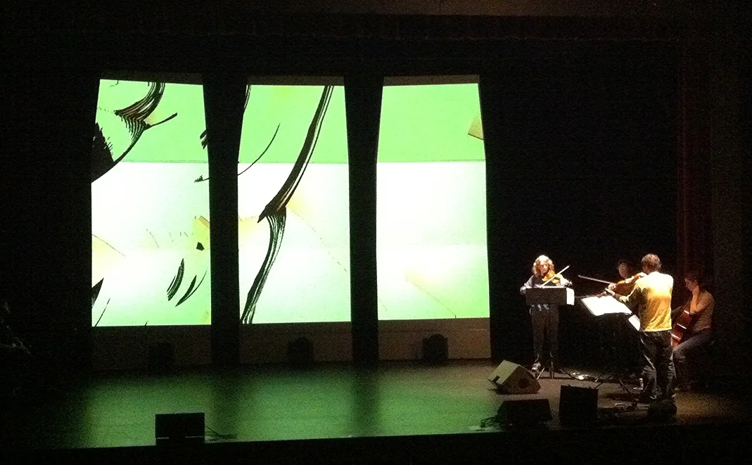 At 2012's Other Minds Festival in San Francisco, Johnny was commissioned to perform live video with the Del Sol Quintet, with the world premiere of Ken Ueno's piece "Peradam" - Reacting to the stage set, I built an impromptu video mapping on the theater's sound baffles.